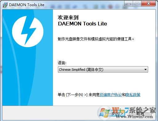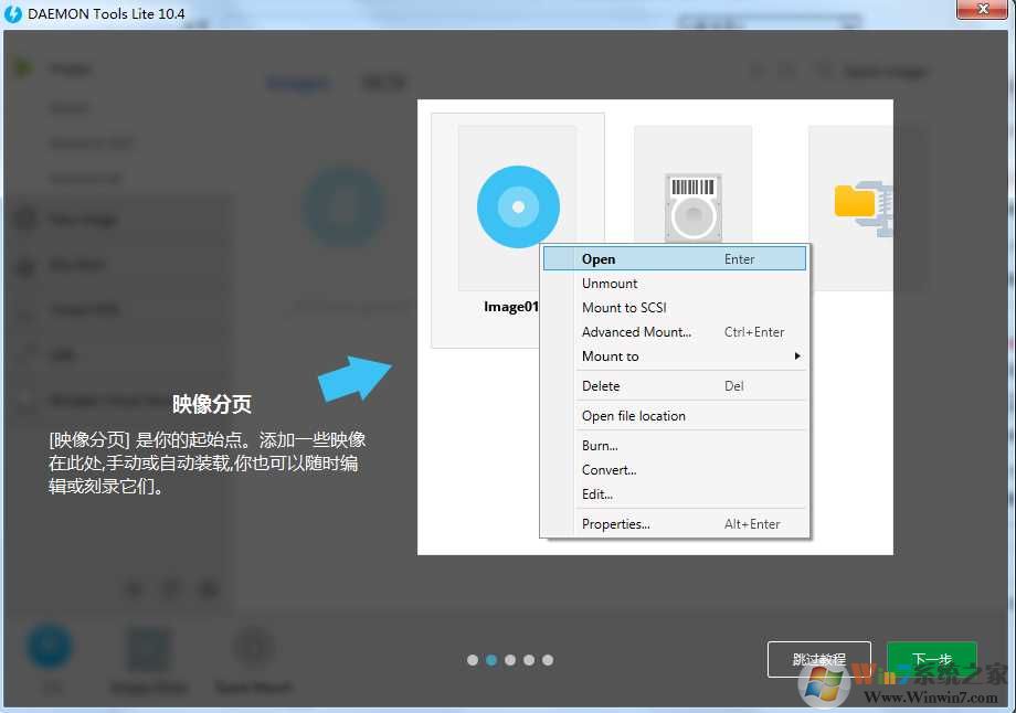 1、打开daemon tools lite,初次打开会出现教程,很是方便,不过太啰嗦,小编直接跳过;winwin7.com