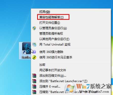 1、右键点击要运行的软件或游戏,在右键菜单中选择“兼容性疑难解答”;