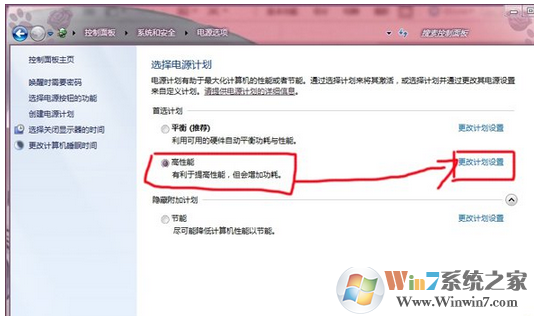 3.选择高性能→选择更改计划设置。