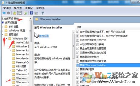 3、进入本地组策略,依次点击【计算机配置】-【管理模版】-【windows组件】-【windowsinstaller】在右边找到【禁用windowsinstaller】,如图所示: