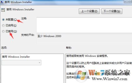 4、将【禁用windowsinstaller】状态改为未配置,或者已禁用即可,如图所示: