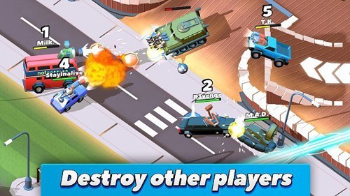 4、该游戏只有一种游戏模式,那就是即时线上对抗模式!这也直接体现出本作的游戏重点,那就是多人竞技。可以说游戏很好的抓住了时下玩家们最喜欢的游戏方式,而且还进行了大幅度的简化,你甚至可以不需要了解到任何的游戏玩法就能直接进入房间跟来自各地的玩家一起战个痛苦。游戏采用触屏的操作方式,点击屏幕左右两侧即可让车辆进行移动,而当你拾取到武器后点击按键就能将其发射出去,非常容易上手