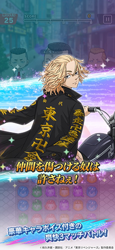 在原作中,故事描述主角花垣武道为了拯救遭到最凶恶不良组织东京卍会杀害的国中时代恋人橘日向,而穿越时间回到12年前的国中时代,面对自己不断持续逃避的人生。游戏版中,则将会采取三消益智RPG的游戏玩法,玩家将可以收集包括原作主角花垣武道与佐野万次郎、龙宫寺坚、场地圭介、松野千冬等原作人气角色加入伙伴组队,打造玩家自己专属的最强东京卍会,以称霸全国为目标,展开游戏版原创的故事剧情冒险。 同时游戏内也将会收录众多游戏版专属的服装让玩家们自由换装打扮,喜欢原作的玩家们届时可别错过!
