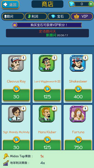 3、游戏中我们不仅仅可以用金钱去购买更多的商业用地来提升自己赚钱的速度,还可以招聘一些管理人员,它们往往自带属性,可以让我们的财富收益成倍增加。游戏加入了“商业顾问”,其实也就当APRG中比较常见的宠物,可以增加玩家的属性,让我们的利益可以最大化。这些商业顾问分为五个等级,我们可以选择三名商业顾问来帮助自己,如何选择就看玩家们自己的需求了,这种招聘的方式让玩家们能有更多选择和组合的想法,多方位思考自己的商业帝国所需要的人才,培养作为真正商业大亨的领导能力。