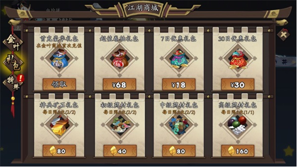 这大概是平民玩家最关心的问题了,最初通关送的金叶子首先要留下来买少林英雄令,大部分玩家已经心照不宣了,至于为什么买少林英雄令而不是其他这会在之后细讲。买完英雄令后金叶子的主要用途(仅仅针对平民)在于买药材礼包(看起来紫色最值,但推荐买蓝色),和抽卡。