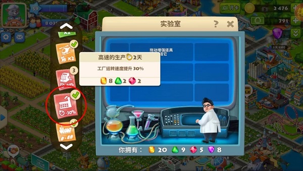 在本阶段中,小镇工厂“生产时间-30%,金币+25%,工厂货架+2”的性能,如果再配合实验室中工厂30%提速生产道具,小镇工厂的生产时间最终至少节省50%,这样的结果,想一想,小翔都觉得兴奋。