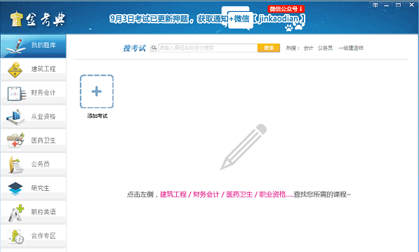 包含建筑工程类,财务会计类,从业资格类,公务员等数百个科目,下载软件都可以在金考典官网免费下载试用,永久免费升级,软件通过主流杀毒软件权威认证,安全可靠。