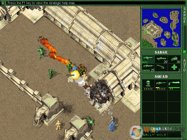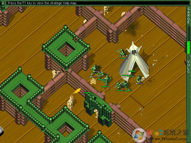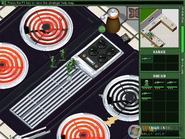 游戏需要要求玩家控制一支活动的塑料人队伍,进行三大战役,执行30多项不同的任务。在开场的动画中,主角沙吉(Sarge)和其他玩具老兵一一亮相,过场动画十分精采。游戏支持3Dfx,其3D效果十分不错,所有单元都采用3D MAX 做框架,然后进行着色的材质处理。游戏中的音效是制作小组到美军演习中录制的,非常的逼真哦。