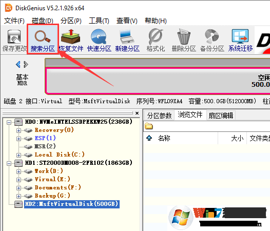 第二步:在软件里找到需要恢复分区的移动硬盘,然后点击“搜索分区”按钮。