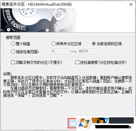提醒:在开始搜索分区之前,可以自己指定搜索范围。软件提供三种搜索范围:整个磁盘、所有未分区区域和当前选择的区域。此外,用户还可以自己指定搜索范围。如果自己对这些设置不是非常熟悉,可以按照默认设置或是咨询在线客服。
