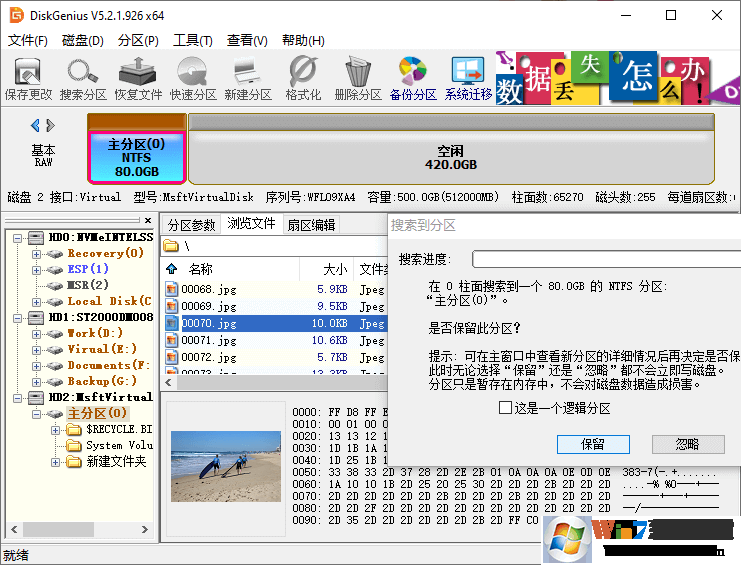每当软件找到一个分区,会弹出下图所示的提示。这里需要用户自己选择“保留”或是“忽略”。在整个搜索分区过程中,软件会找到若干分区,但是,其中有些分区是不需要恢复的。这时候,可以预览分区里的文件来判断这个分区是否需要恢复,是的话点击“保留”,否则点击“忽略”。