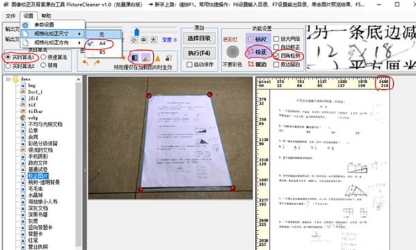 7、支持四角检测后自动校正,校正后图片可以规格化尺寸及方向输出(A4、B5,300DPI)。