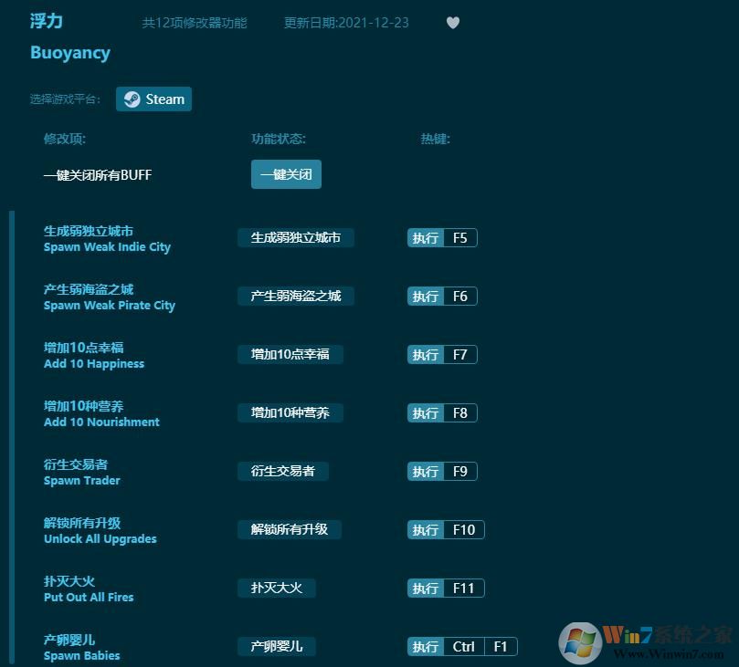 3、运行“浮力”游戏4、游戏运行后点击“加个Buff"按钮,当然大家也可以进行单项修改