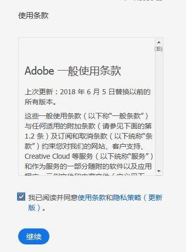 登录完成,自动弹出程序的安装协议,直接勾选“我已阅读并同意使用条款和隐私策略”,并点击继续,如图: