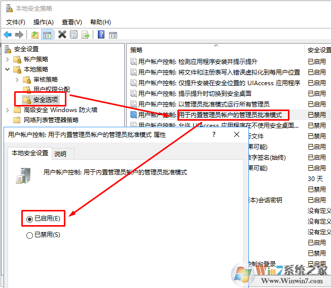 2、输入完毕,回车(确认),来到“本地安全策略编辑器”如图所示,然后,按照图片上的,依次打开:安全设置>本地策略>安全选项>用户帐户控制:用于内置管理员帐户的管理审批模式,然后,双击它,将改为:已启用,点击应用,再点确定。如图所示: