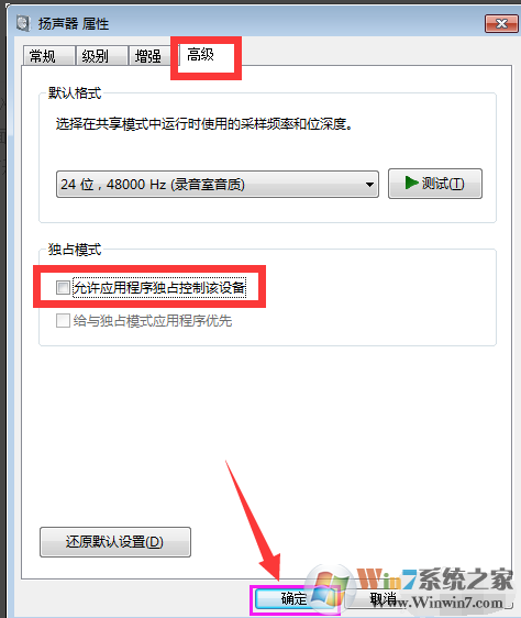 3、打开的“扬声器 属性”界面中,切换到“高级”选项卡,清除勾选“允许应用程序独占控制此设备”项,点击“确定”完成设置操作。