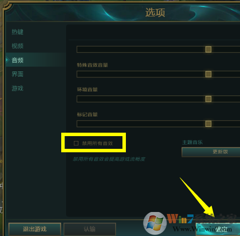 2、打开“选项”界面后,切换到“音频”选项卡,勾选“禁用所有音效”项,点击“确定”按钮关闭“选项”窗口。