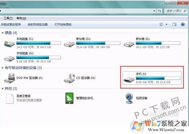2、因为APP安装失败,手机内存卡中会出现一个临时文件,大家可以通过数据线连接电脑,然后会在电脑上看到一个“手机”的可移动设备,如下图所示,就在红框选中的位置。