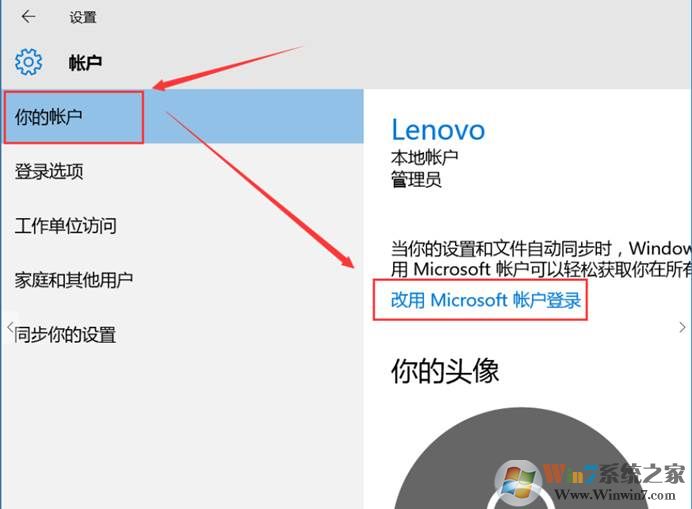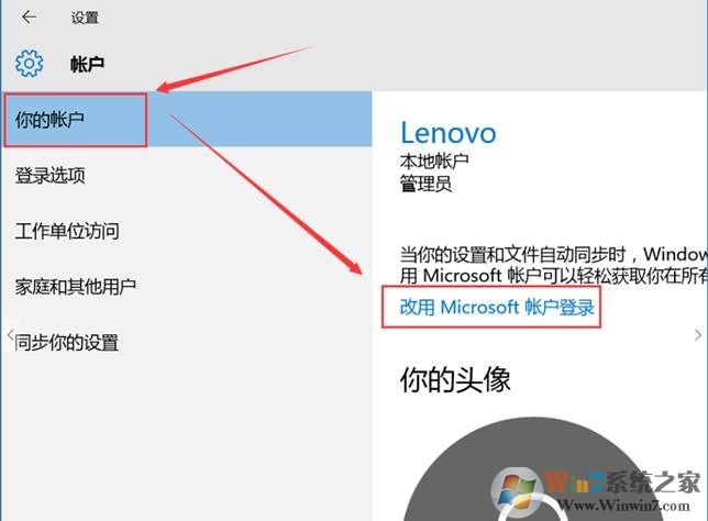 2、 在弹出的设置页面中选择“你的账户”——单击“改用Microsoft账户登录”,如图: