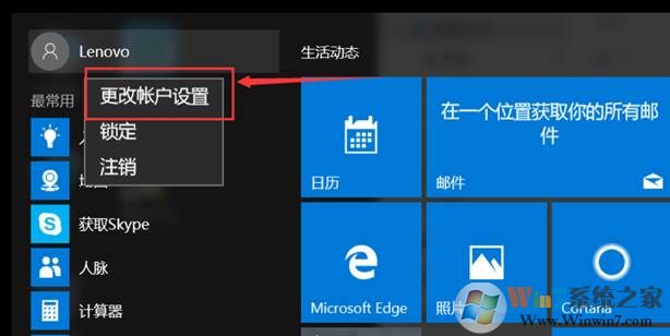 1、 点击Win10左下角的开始菜单,点击上面的帐户头像——选择“更改账户设置”,如图: