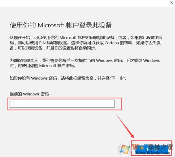 2、 在出现的页面中输入当前微软账户密码,然后选择“下一步”;