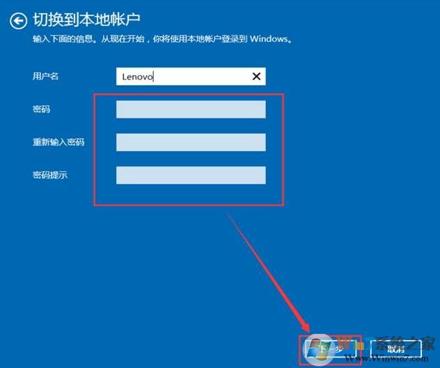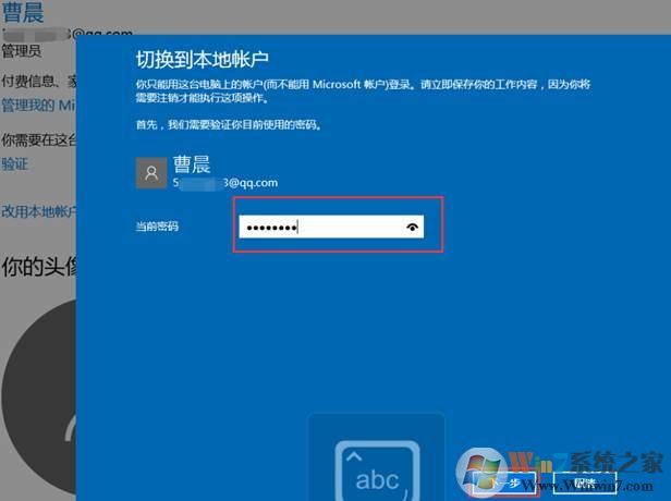4、 输入当前本地账户密码点击:“下一步”。切换完成。(如果本地账户无密码保持空即可)
