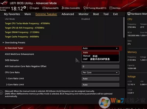 1、进入超频选项,选择ai overclock tuner,出现三个选项,第一为AUTO,第二为手动,第三个则是我们即将选择的XMP。
