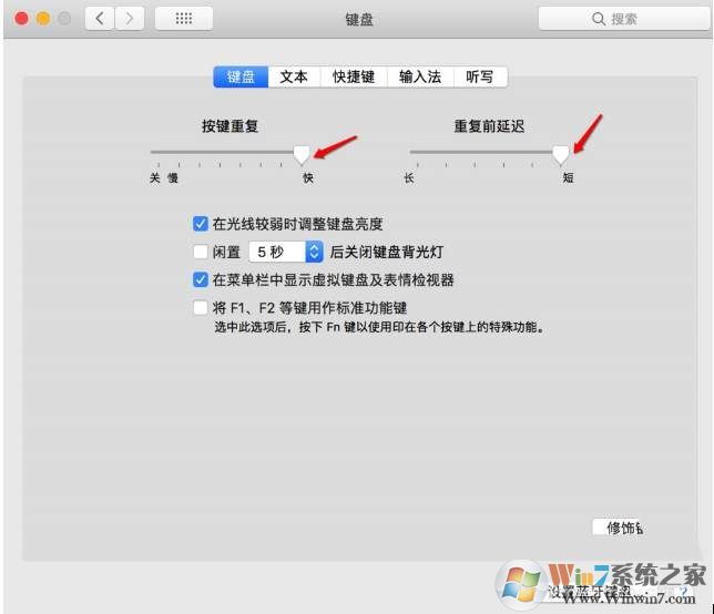 3、将【按键重复】及【重复前延迟】设置到最高,此时输入一串长长的文字,长按delete键时便可连续删除了,此时的delete键和Windows电脑的delete长按删除功能就一样了。