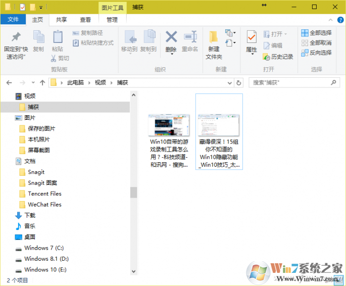我们打开当前用户的“图片”文件夹下查找,结果一无所获。其实,图片是作为视频类别保存的,在资源管理器的“此电脑→视频→捕获”文件夹下,硬盘实际保存位置为:X:\Users\<用户名>\Videos\Captures。