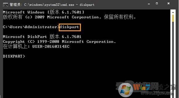 2、在命令提示符中写入diskpart,打开回车来启动diskpart程序,通过这个程序来查看硬盘序列号;