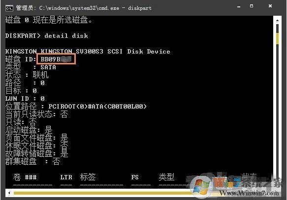 5、选好要查看的硬盘后,写入detail disk,打开回车后会将硬盘的信息显示出来,其中磁盘ID就是大家要查找的硬盘序列号。