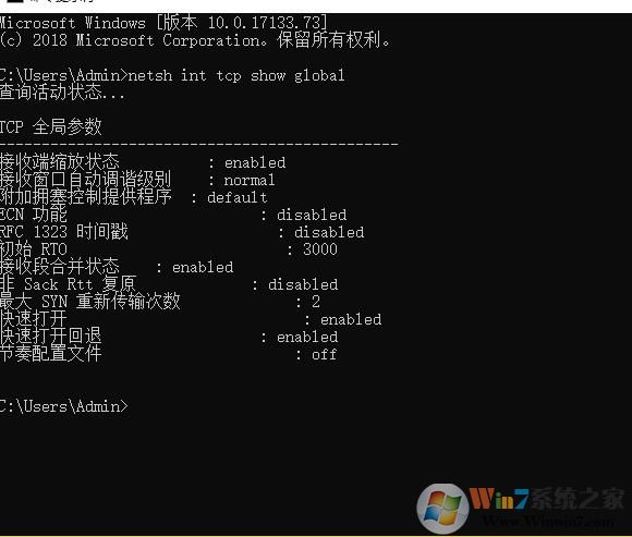 命令提示符输入:netsh int tcp show global 进行查询
