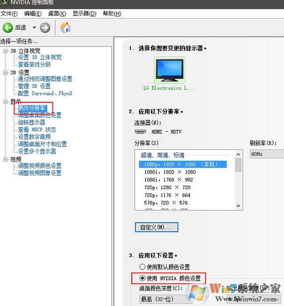 1、在桌面点击右键进入(NVIDIA控制面板),左侧栏中(显示)-(更改分辨率)-(3应用以下设置)中选择(使用NVIDIA颜色设置)