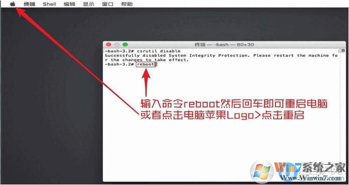 5、终端内输入命令reboot即可重启电脑,或者点击Apple logo然后点击重启。