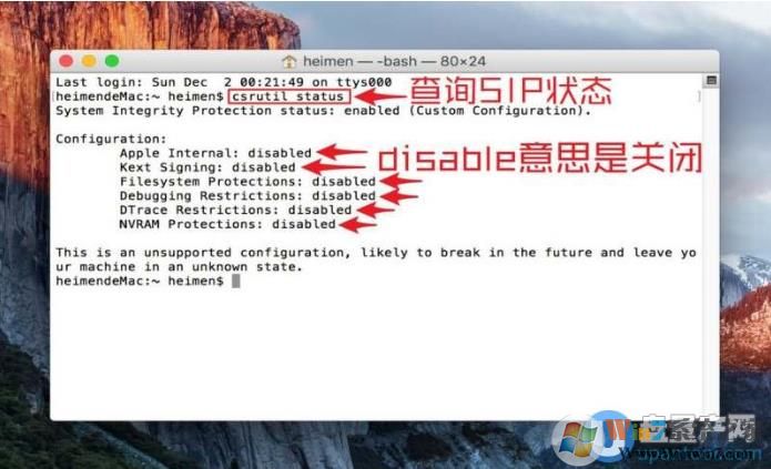 3、终端内输入命令:csrutil disable 然后回车执行,注意中间有个空格。