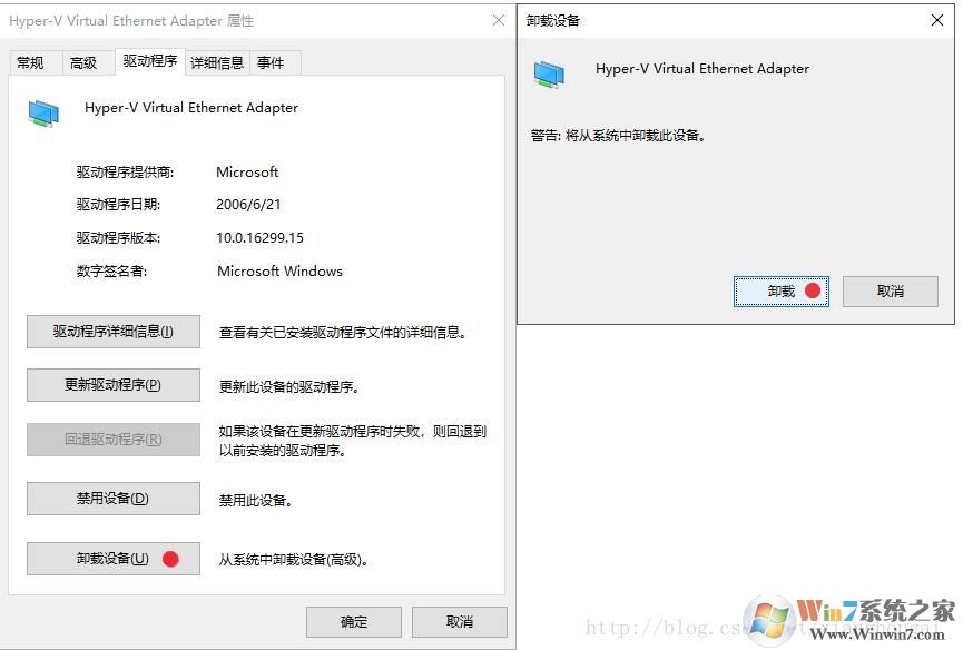 4、在驱动程序界面,点击卸载设备,然后点击卸载,这样就可以把该vEthernet删除掉了,其它的也一样操作即可。