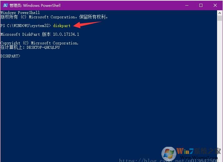 2、打开Windows PowerShell之后,我们要使用 Diskpart磁盘工具了,输入Diskpart 回车。