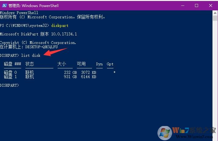 3、输入 list disk 回车。这个命令为显示你的所有硬盘;