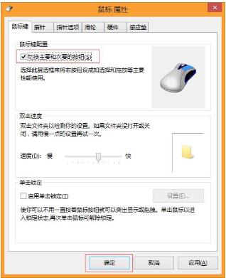 第二步:在鼠标的属性中点击勾选【切换主要和次要的按钮】,点击确定即可,此时便可以适配惯用左手的人使用。