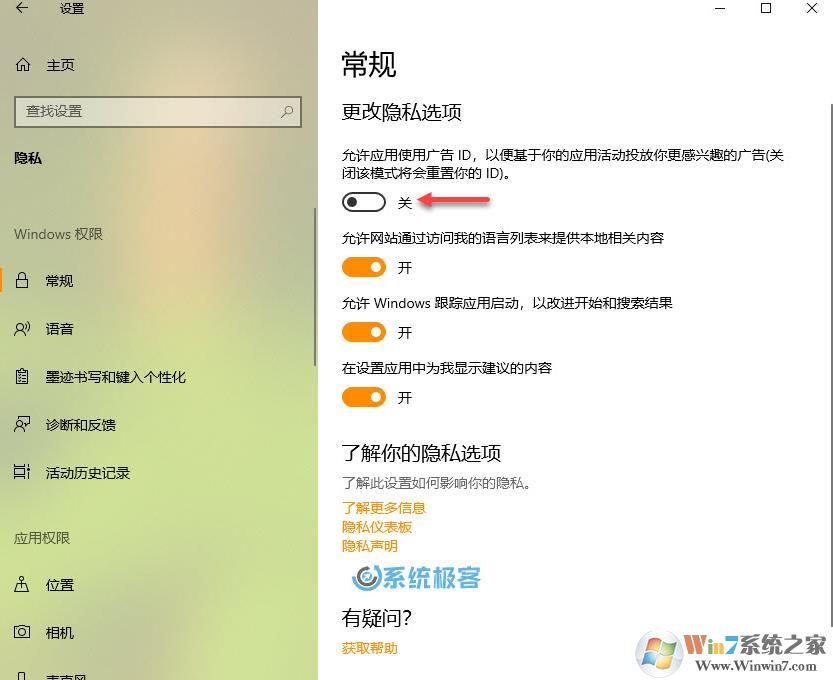 在 Windows 10 中删除广告标识符最简单办法就是在「Windows 设置」将其关闭: