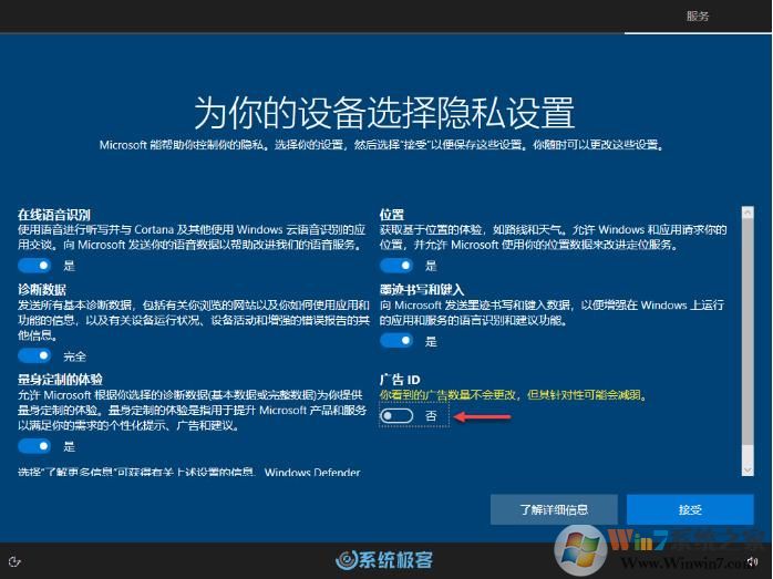 方法三:在Windows 10安装过程中配置「广告 ID」