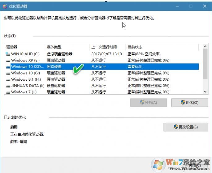 2、这时就会出现优化驱动器工具界面了,我们可以在媒体类型这一项中查看到你的硬盘是否是固态的,如下图,安装有Windows10的驱动器是固态硬盘。