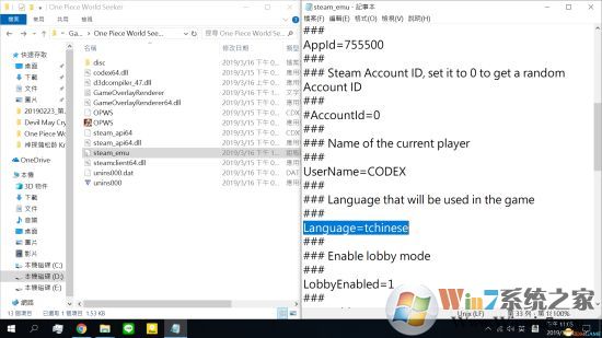 2、找到steam_emu.ini配置文件并打开,搜索Language=english ,把english改为schinese或tchinese。
