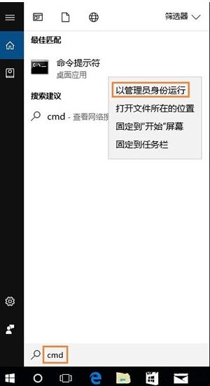 1、在Win10搜索框搜索CMD,在搜索结果中右击CMD,然后选择“以管理员身份运行”。如图所示: