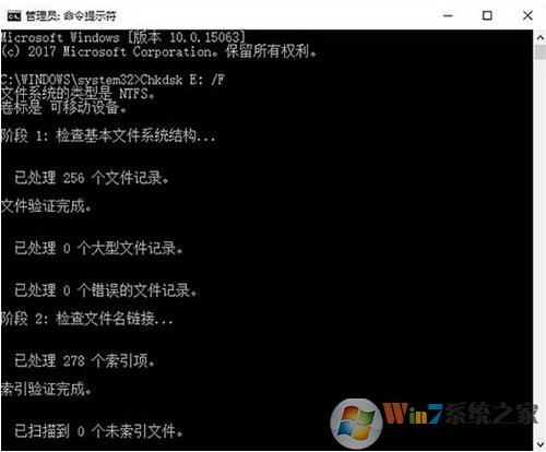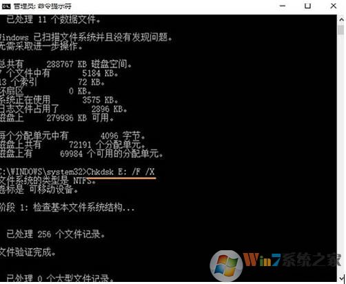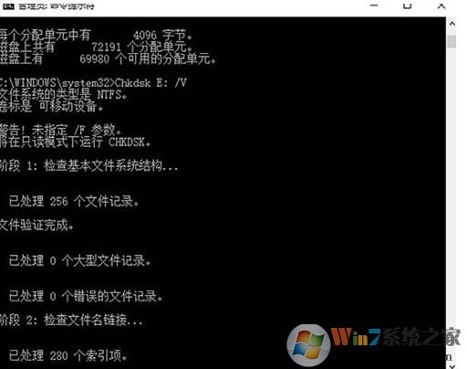 2、在命令符提示对话框中直接输入Chkdsk E: /F 后按回车(E:是问题U盘的盘符),然后耐心等待程序运行到结束。如图所示: