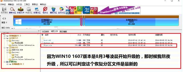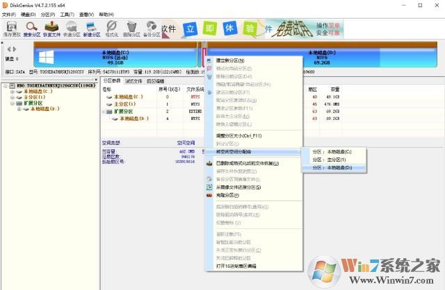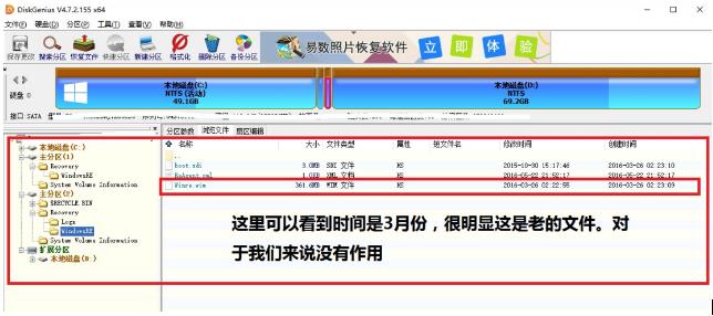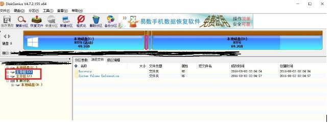 1、我们可以使用专业分区管理的工具DiskGenius查看,看到恢复分区对应的两个主分区1和2: