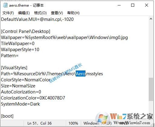 3、用记事本打开aero.theme,你可以看到当前视觉样式(VisualStyles)的路径为: