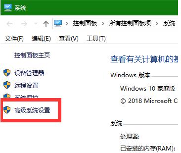2.    在打开的窗口的左侧,点击“高级系统设置”,具体如下图所示。