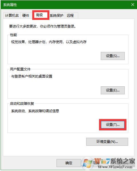 3.   在高级选项卡下,点击“启动和故障恢复”中的“设置”按钮: