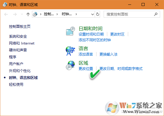 3、在“时钟、语言和区域”设置窗口中点击“区域”分组下的“更改位置”选项(图3);